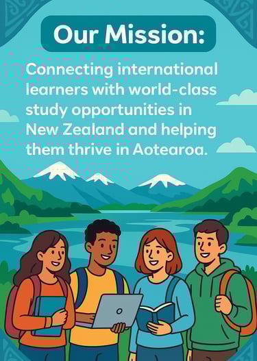 Our mission is to connect international learners with world-class study opportunities in New Zealand, empowering them to achieve their academic goals while experiencing the unique culture, diversity, and warmth of Aotearoa.